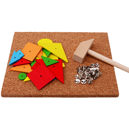 Een klassieke Hamertje Tik bestaat uit een aantal spijkertjes, een onderbord van bijvoorbeeld kurk, een aantal vormpjes en natuurlijk een hamer. De vormpjes zijn de "echte" basisvormen, zoals een cirkel, vierkant, driehoek en rechthoekje, vaak in heldere kleuren. Sla het spijkertje door het gaatje in de vorm op z'n plek op het bord en maak zo je eigen schilderij. In (bijna) alle sets vind je handige voorbeeldkaarten om na te kunnen maken. Zo kun je meteen met de set aan de slag als het nog iets te moeilijk is om zelf afbeeldingen te bedenken met de abstracte vormpjes. Zo is Hamertje Tik ook heel geschikt om zelfstandig mee te spelen!
